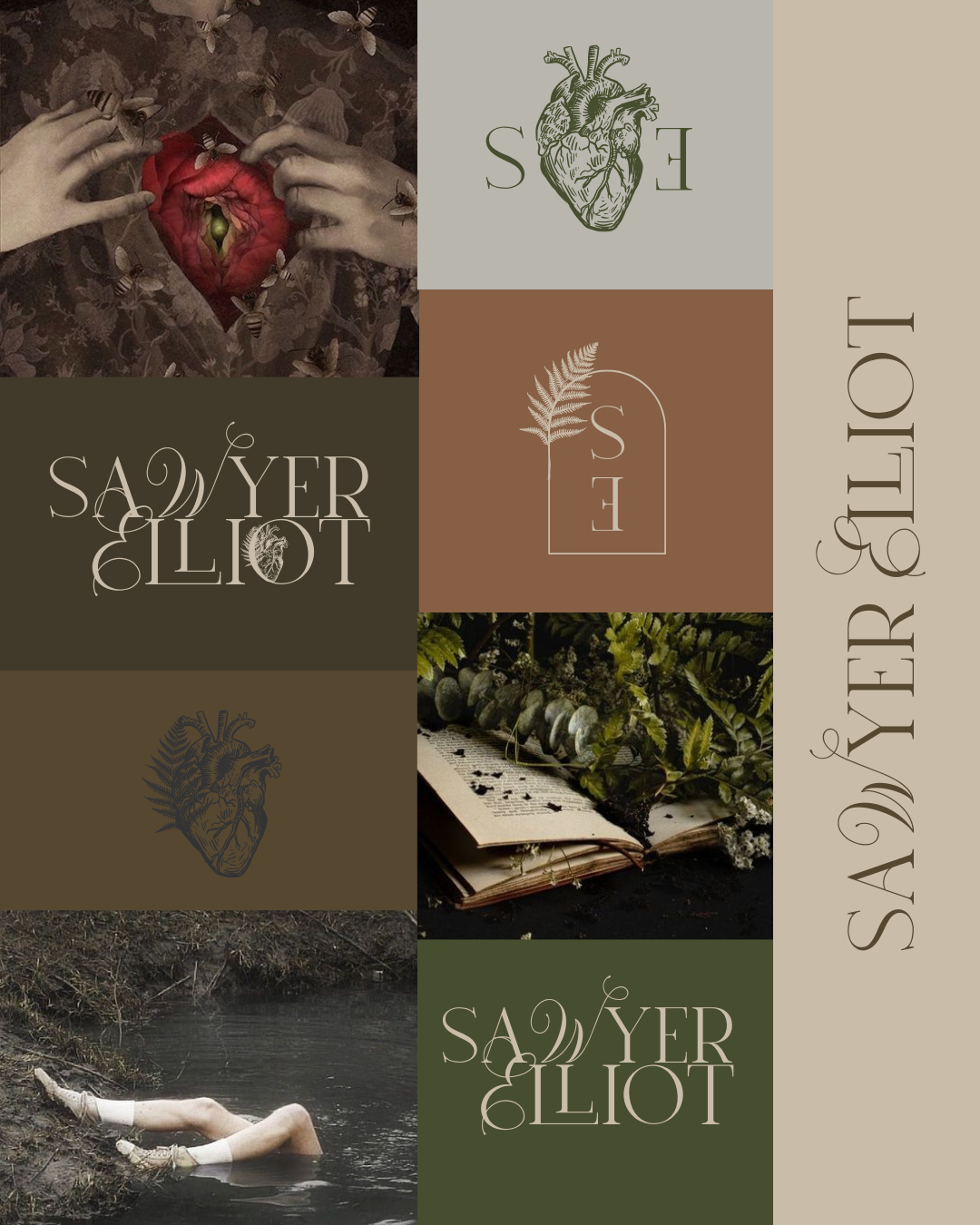 I wanted my own author branding to capture the haunting, arcane essence of the queer spec fic I write under my gender-neutral pen name, Sawyer Elliot. The palette—woodland greens, rich browns, and muted earth tones—reflects a world both grounded and otherworldly. My logo, an anatomical heart entwined with a fern, symbolizes the delicate balance between life and the supernatural. The typography strikes harmony between the masculine and feminine, a subtle nod to my nonbinary identity. Every element of this design is an extension of the stories I tell—macabre, intimate, and touched by the unknown.